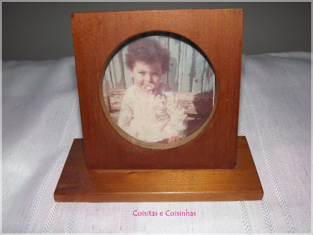 Primeiramente, vocês vão precisar de um porta retratos de madeira (ou um porta lápis ou o que mais vocês desejarem). Eu usei esse que já tem mais de trinta anos e tem essa foto muito fofa de quando eu tinha um aninho. Ele é um xodó pros meus pais e nem em sonho posso tirar essa foto, então pensei em fazer umas modificação bem leve nele.