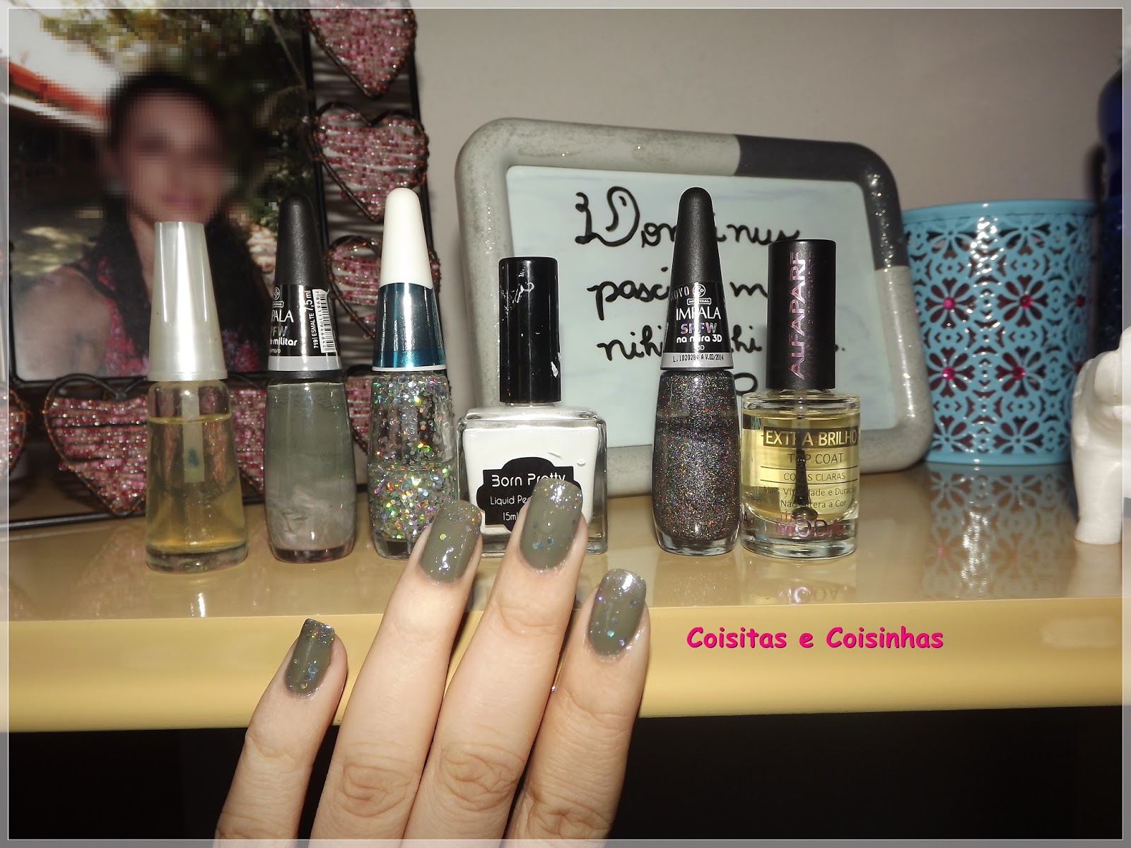 Último dia de junho (meio ano já se foi!!!) e vim msotrar pra vocês minha escolha desse mês no Desafio 12 meses, 12 esmaltes: o Verde Militar da Impala. Ele é da coleção SPFW, bem antiguinha já e uma das poucas que comprei inteira. Só havia suado ele uma vez. Apliquei duas camadas dele e como adoro um glitter, fiz uma francesinha esponjada com o Na Mira 3D, dessa mesma coleção. Depois quis fazer um efeito degradê, que não ficou muito bom, e usei o Disco Ball, também da Impala. Finalizei com o extra brilho da Alfaparf.