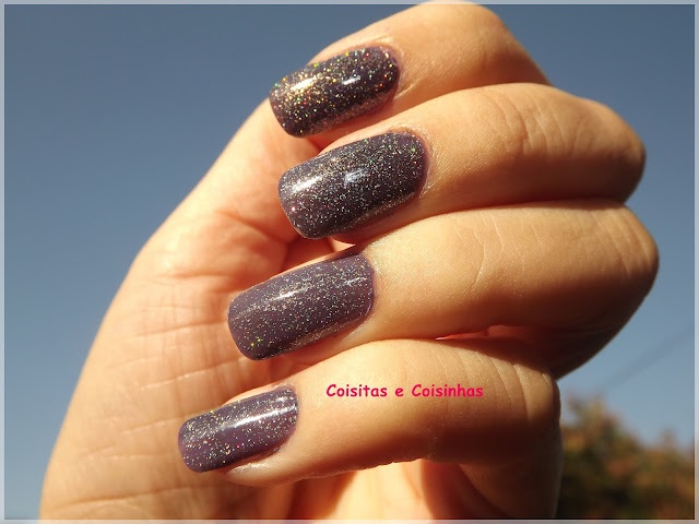 O Azul Aviador, que para mim é roxo, é da coleção SPFW. Foi uma das poucas coleções que comprei inteira, lá pro ano de 2011, e foi um arrependimento só, pois os esmaltes parecem água com corante, de tão ralos. Só tinha usado ele uma vez e, com essa segunda, já está quase no fim, hahaha.