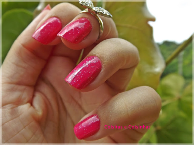 Para finalizar, usei uma mão do Atitude Pink da coleção Penélope charmosa da Risqué. Tenho há anos (venceu em 2013) e nunca usei, pois é uma água com corante e não tenho paciência para mil camadas. Até tinha dado pra minha mãe e como vi nas coisas dela esses dias peguei para poder fazer essa manicure.