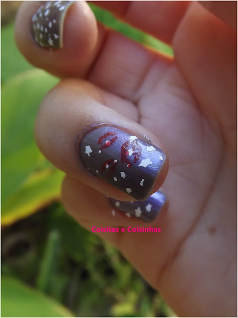 Na mão direita quis fazer uma graça carimbando beijinhos da mesma plaquinha, mas não ficou bom. E não, não limpei os cantinhos porque como já disse, estava com raiva, kkkkkk. Deixei pra tirar no banho.