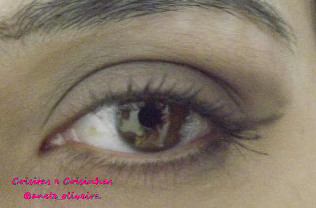 As fotos abaixo estão péssimas, tenho dificuldade de fotografar meus olhos com a máquina. E também não sei me maquiar, então fiz uma make bem básica com as 4 cores. Com a mais escura consegui fazer o delineado, então achei ótima! Antes disso, havia usado a segunda mais escura para esfumar o canto externo e com as mais claras, fui fazendo o degradê.