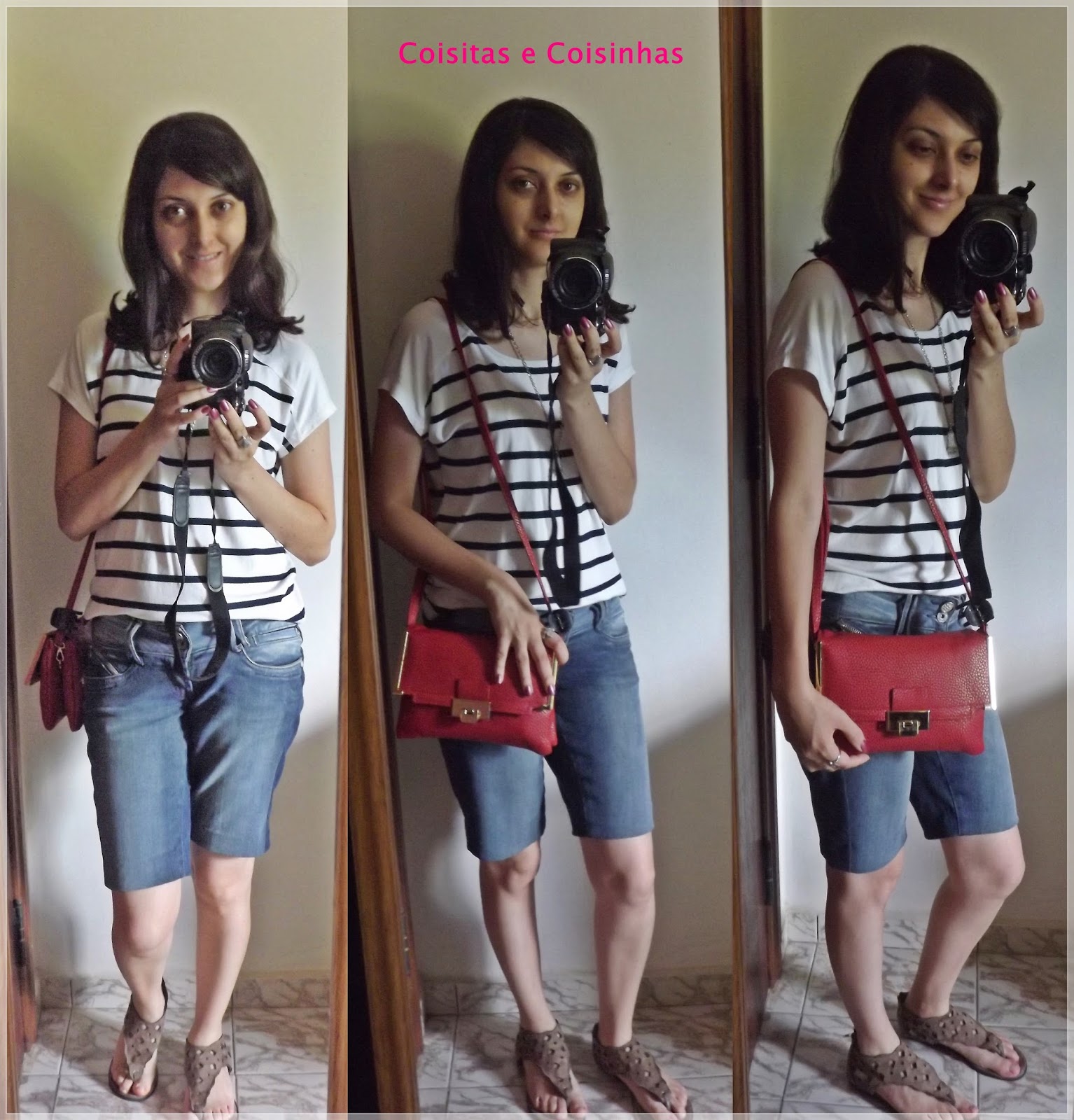 Meu look foi bem simples e como sempre muito confortável. Camiseta com listras (Hering), calça jeans (C&A) dobrada na barra para dar um charme e meu coturno (Bottero) velho de guerra. Para facilitar, mochila (recebida da Ella Store e mostrada nesse link).
