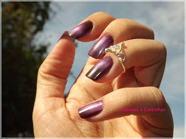 Hoje trago um esmalte que comprei faz bastante tempo (mais de um ano). Foi, inclusive, o primeiro magnético que comprei para experimentar e acabou ficando encalhado no gaveteiro e passei os outros magnéticos na frente dele. Mas deixa de blablablá e vamos ao esmalte, o Julia é Sonhadora da Luxor. O efeito dele é menos visível que os da Bruna Marquezine (mostrados aqui e aqui), porém achei ele menos grosso, então gostei mais. A duração foi ótima, achei que sairia logo mas usei por 5 ou 6 dias. E o brilho é todo dele.