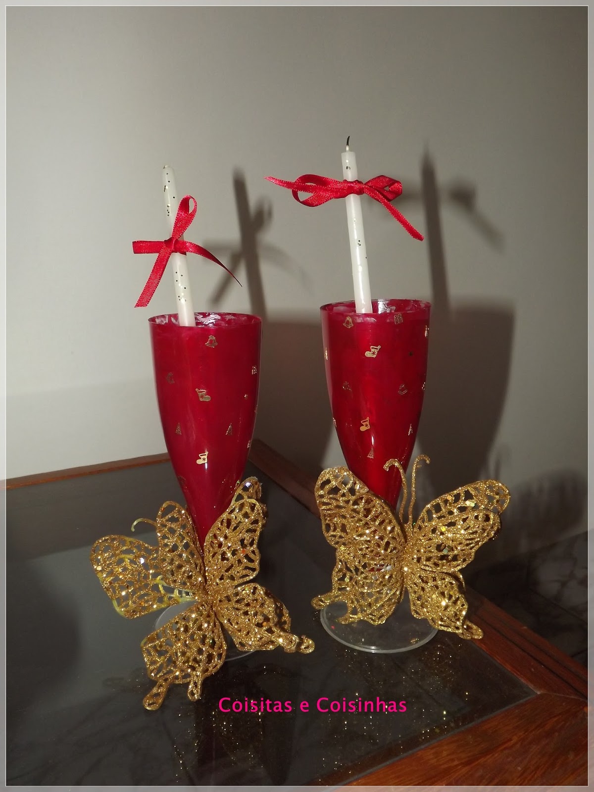 Usando base, colei os enfeites de unhas (natalinos, da Born Pretty Store) pela taça e no pé dela, prendi um enfeite natalino de borboleta. Na vela, usei esmalte de glitter dourado e coloquei uma fita vermelha. E eis o resultado: