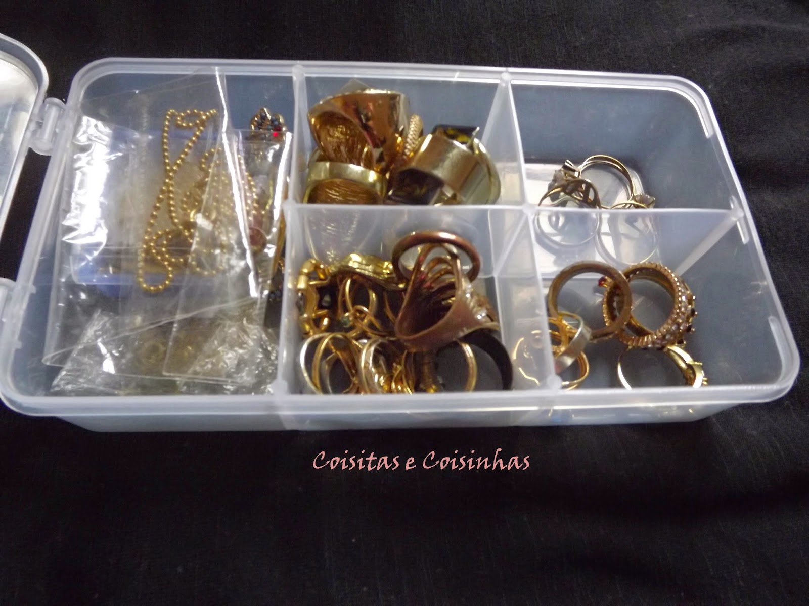 Essa é a caixinha dos anéis dourados e das correntinhas douradas com alguns pingentes também dourados.