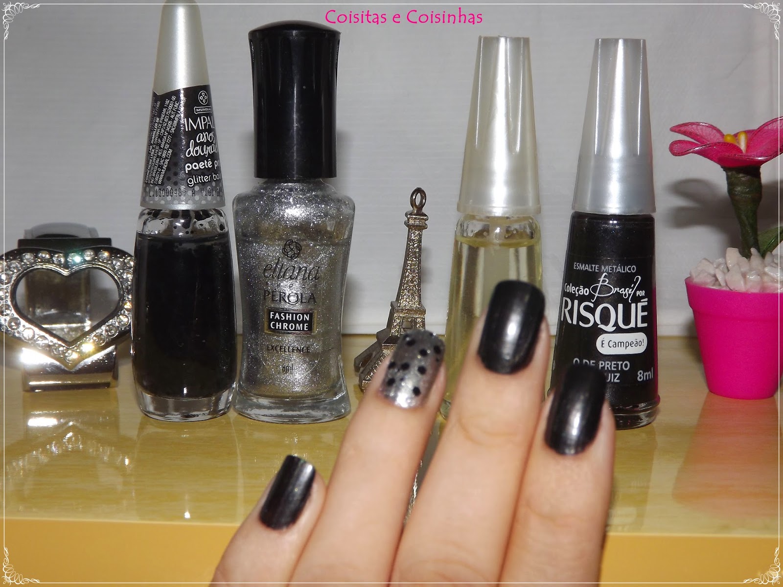 No anelar, usei o Excellence da Eliana Super Pérola, também uma camada. E então, sem querer, usei o esmalte com a letra P, o Paetê Preto da Impala.