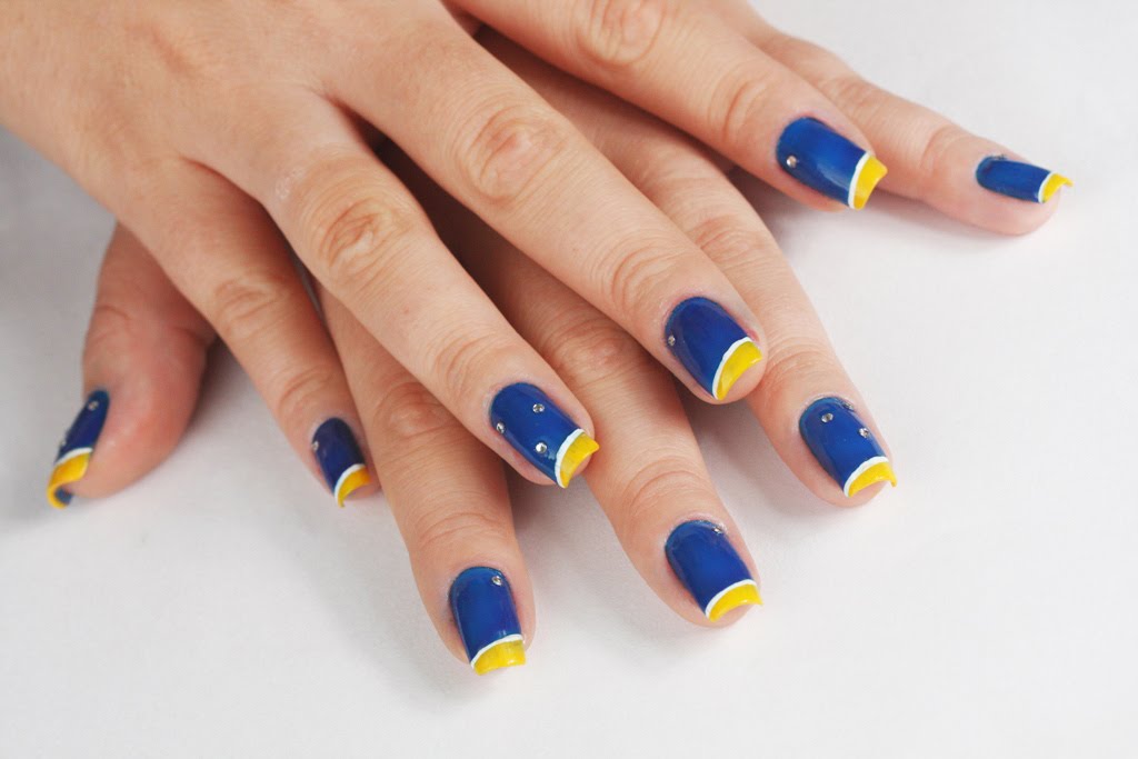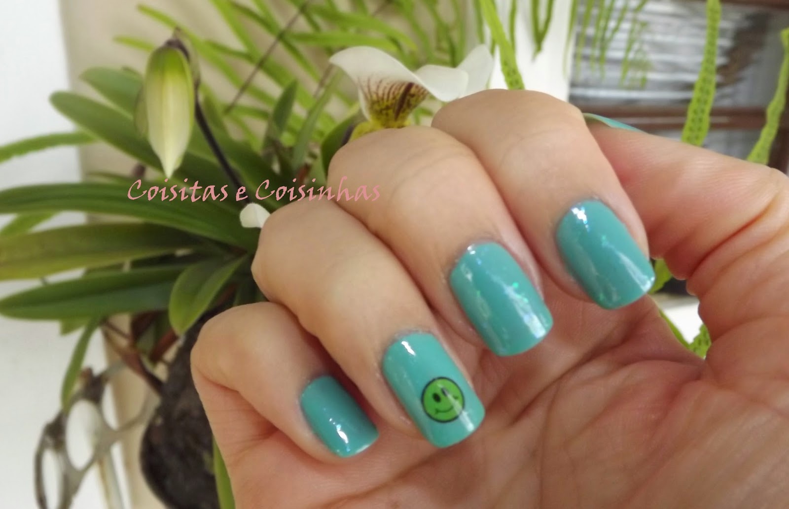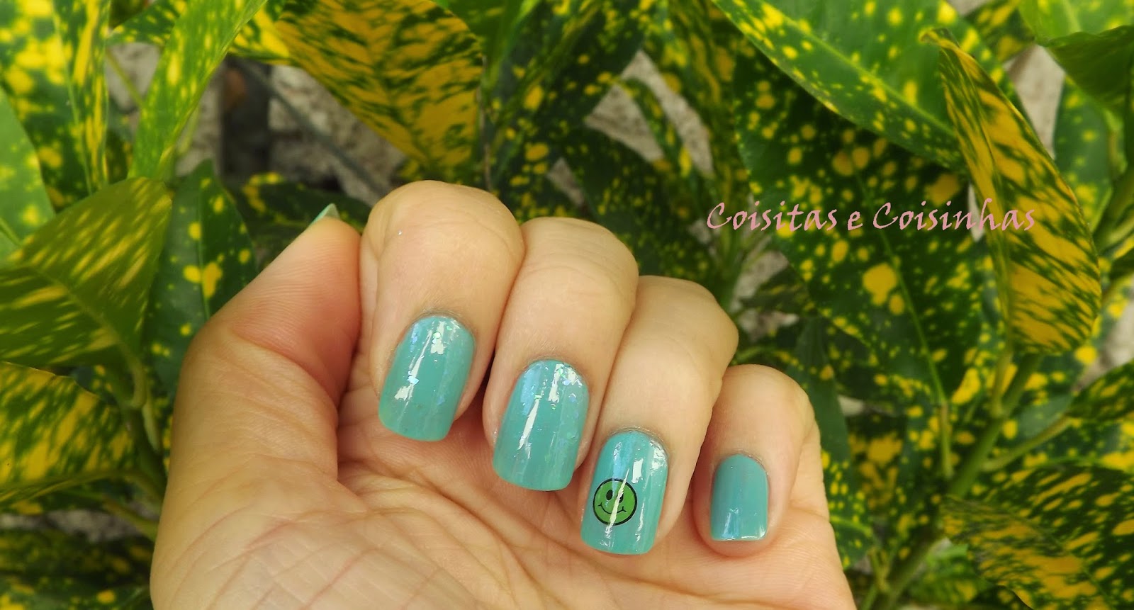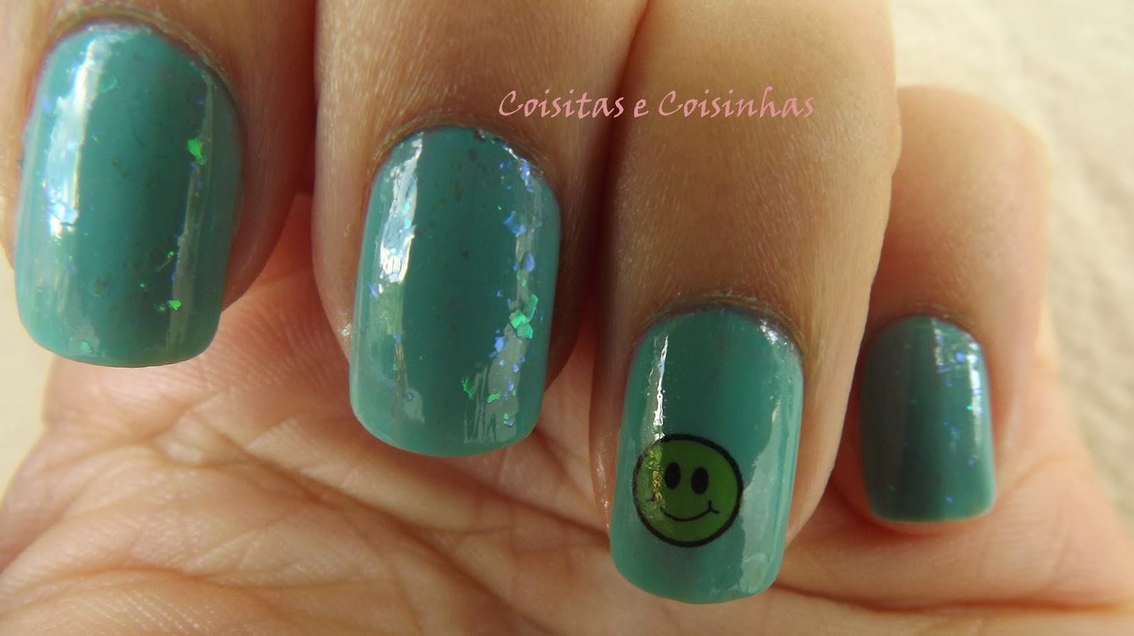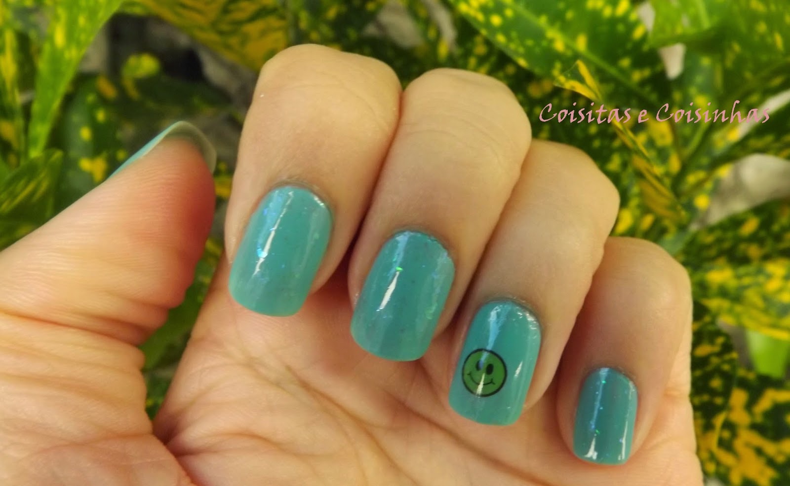 Para essa manicure, usei esmalte Nati Coleção Acústica Musical e flocado Impala Novo 70 Paz e Amor, que é azul e verde. No anelar, usei uma tatuagem de unha com um Smile amarelinho e feliz. :)