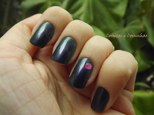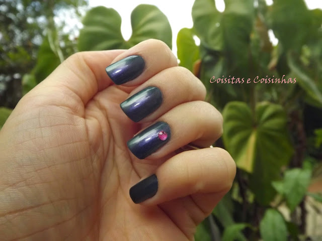 Foram três mãos do esmalte, que possui efeito prisma e por isso apresenta as cores roxo, azul marinho e verde escuro. Impossível não amar! Ele é da mesma coleção (antiga) do prismático Abre Alas, que mostrei aqui. Sim, estou nessa vibe de usar meus esmaltes antigos (e quase sempre vencidos) já que prometi controlar meu vício por esmaltes, kkkkkk.