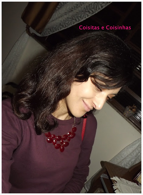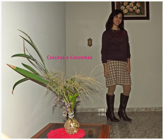 Dia desses tive um aniversário durante a tarde para ir, mas estava frio e o dilema "com que roupa eu vou?" bateu. Como estava frio, resolvi colocar uma blusa de moletom flanelada bem quentinha e lembrei de uma saia de lã estampada que só usei uma vez. Coloquei também um maxi colar, para dar uma glamourizada no moletom. E bota de couro, para deixar os pés quentinhos. E obviamente uma meia calça grossinha, rs.