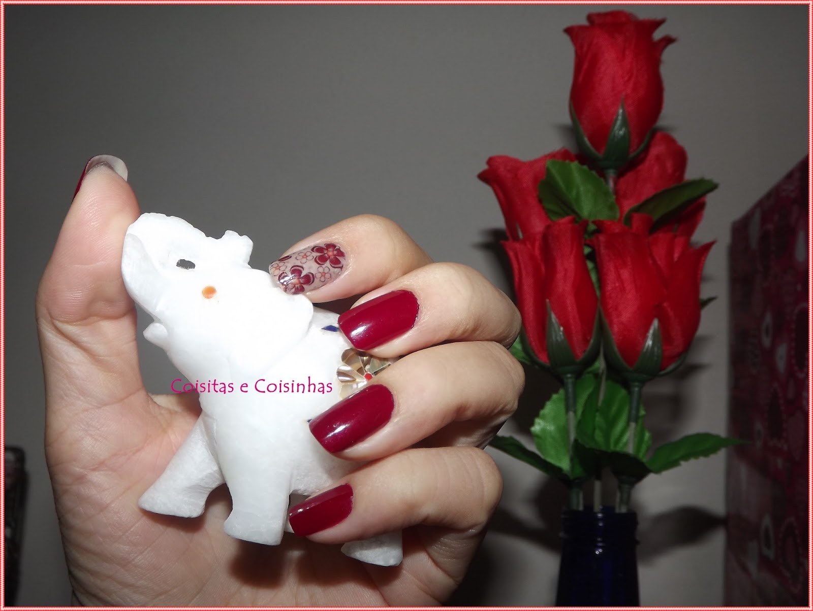 Para essa manicure, apliquei duas camadas do Lábios Ardentes sobre a base da Ideal. Nos indicadores, uma camada do Gelo da Colorama serviu de base pra película. E somente no indicador passei base por cima por causa de película.